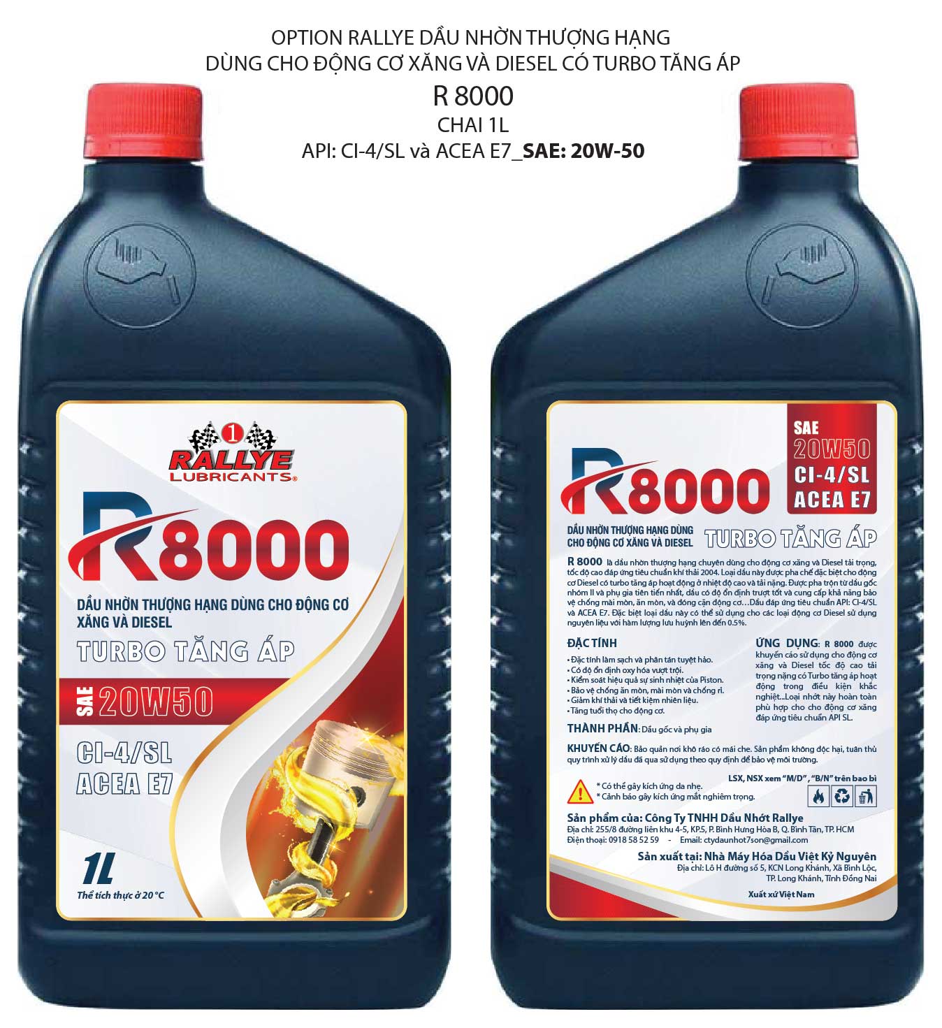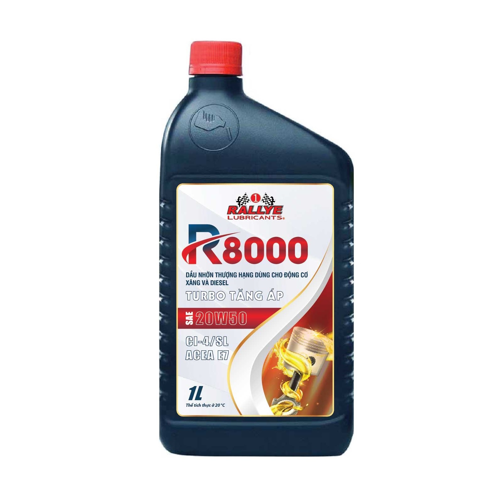 R8000 là dầu nhờn thượng hạng chuyên dùng cho động cơ xăng và Diesel tải trọng, tốc độ cao đáp ứng tiêu chuẩn khí thải 2004. Loại dầu này được pha chế đặc biệt cho động cơ Diesel có turbo tăng áp hoạt động ở nhiệt độ cao và tải nặng. Được pha trộn từ dầu gốc nhóm II và phụ gia tiên tiến nhất, dầu có độ ổn định trượt tốt và cung cấp khả năng bảo vệ chống mài mòn, ăn mòn, và đóng cặn động cơ...Dầu đáp ứng tiêu chuẩn API: CI-4/SL và ACEA E7. Đặc biệt loại dầu này có thể sử dụng cho các loại động cơ Diesel sử dụng nguyên liệu với hàm lượng lưu huỳnh lên đến 0.5%
