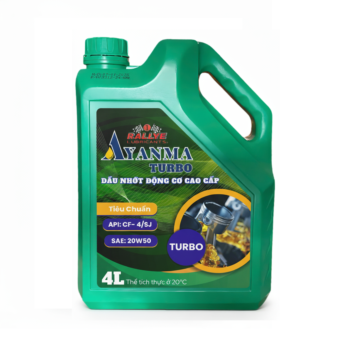 AYANMA TURBO là dâu bôi trơn hảo hạng dùng cho động cơ xăng và Diesel đời mới. Dâu được pha chê từ dâu gôc tinh chê kêt hợp với hệ phụ gia tiên tiền bảo vệ tối ưu cho turbo tăng áp của động cơ. Dâu nhờn này còn giữ sạch động cơ và giúp động cơ tiết kiệm nhiên liệu hơn. Dầu đáp ứng các tiêu chuẩn của API SJ/CF - 4, Allison C - 4, Mil-L-2104E/46152E.